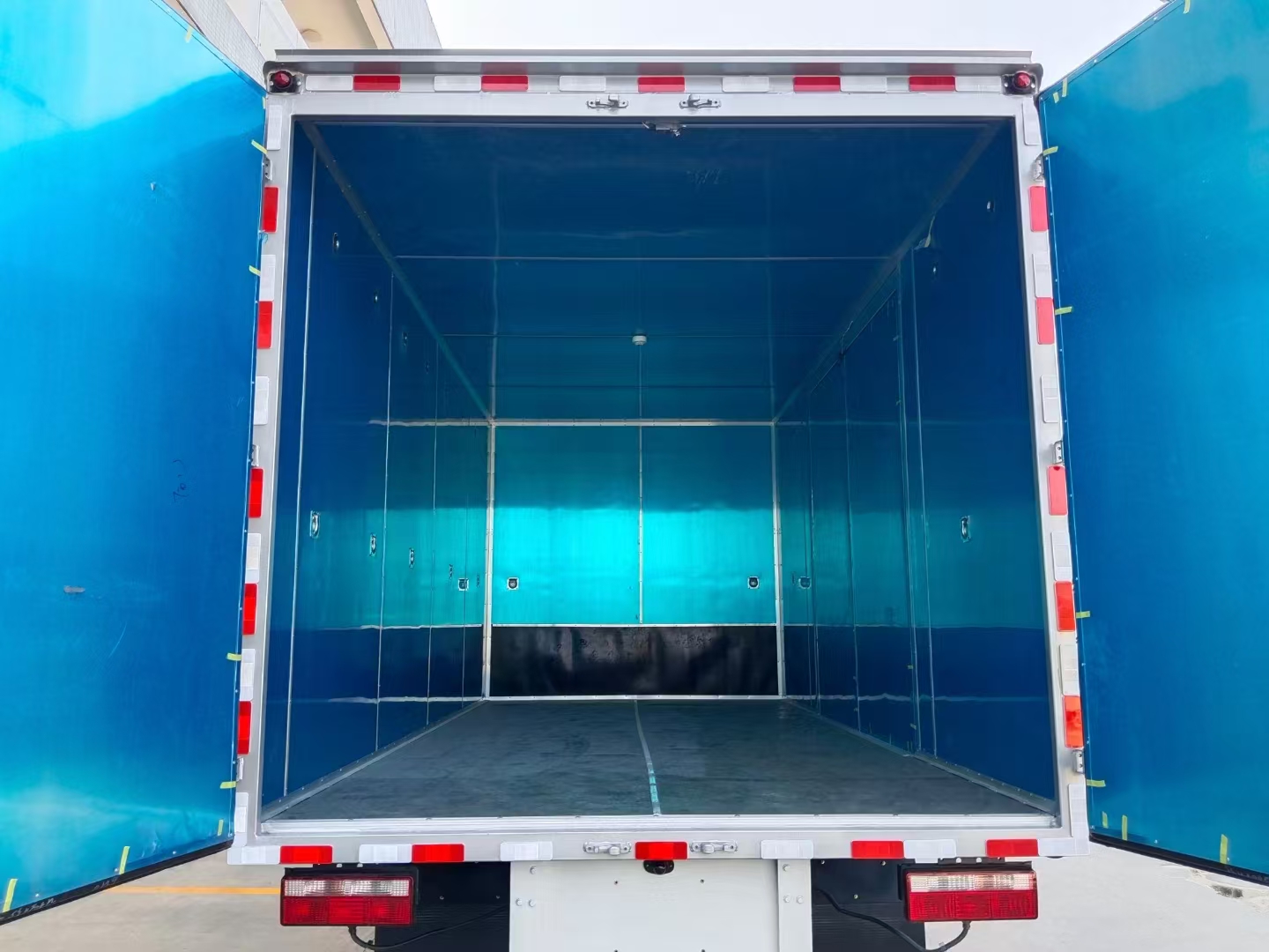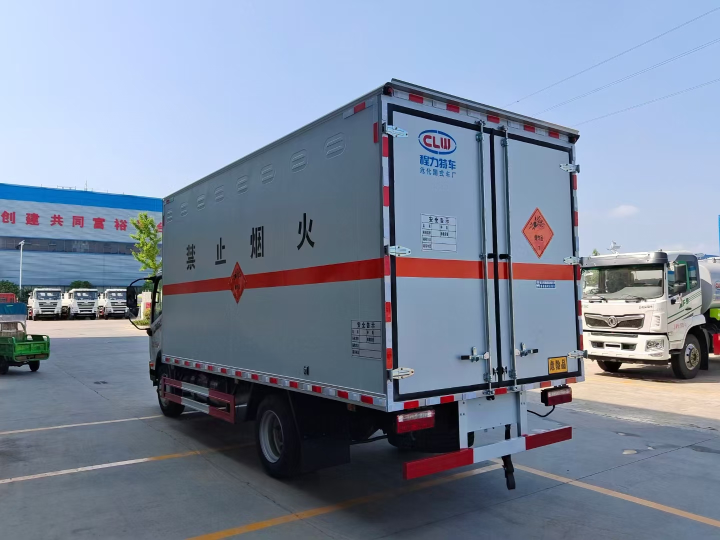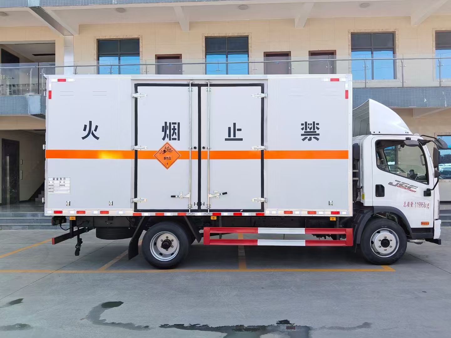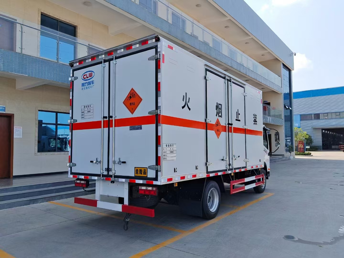 貨箱配置 | 廂體為雙層金屬骨架結(jié)構(gòu),外板采用冷軋鋼板,中間填充阻燃泡沫,內(nèi)飾為鋁板。底板為平板上鋪防靜電膠皮。廂內(nèi)兩側(cè)加裝固定貨物臥環(huán),門框帶防盜報警器,頂部帶煙霧報警器,廂體右側(cè)選裝側(cè)門,隨車配2個滅火器,危險標(biāo)志牌,防火帽,危險品三角頂燈。 (尾部可選裝液壓升降尾板) |