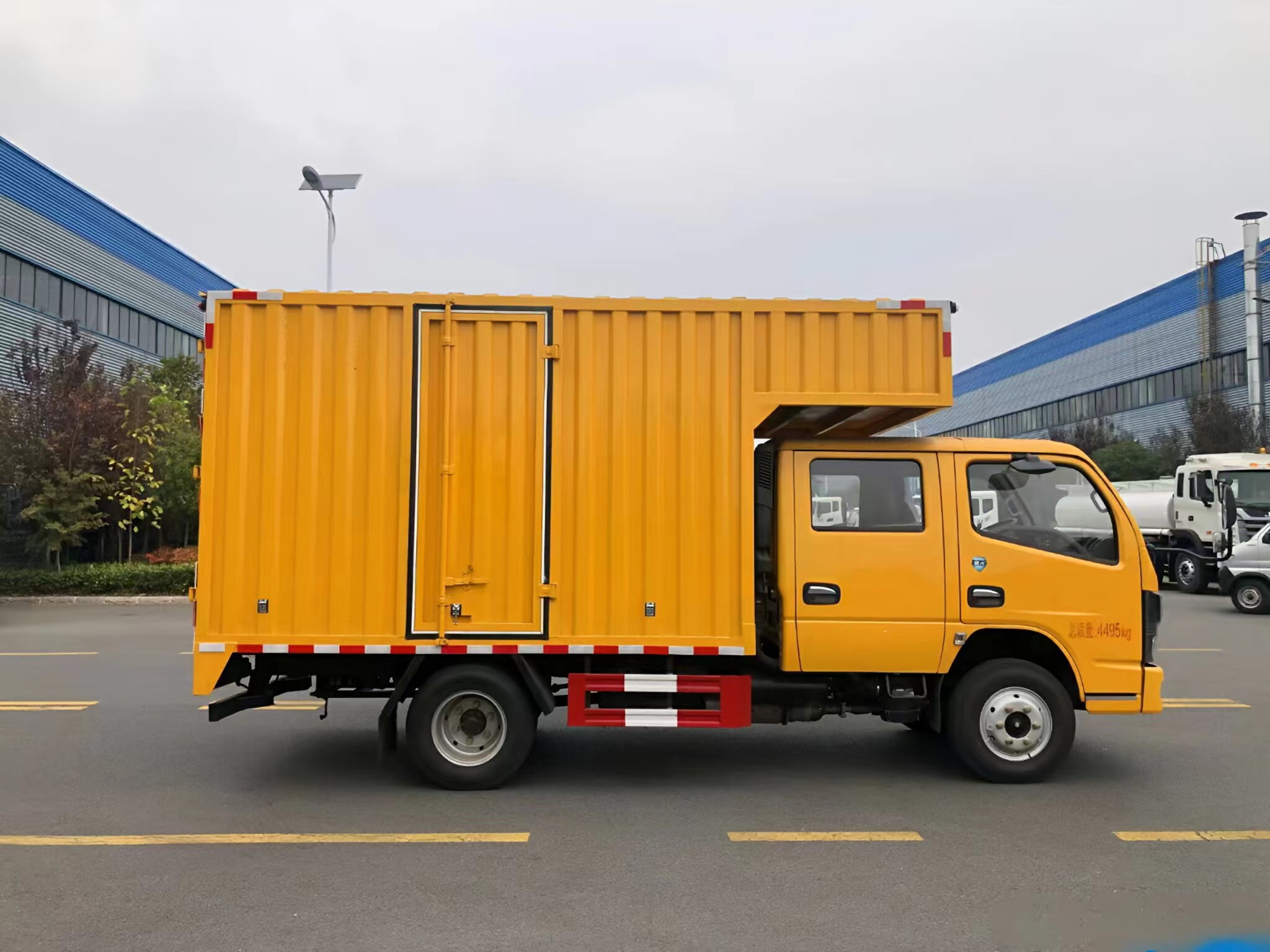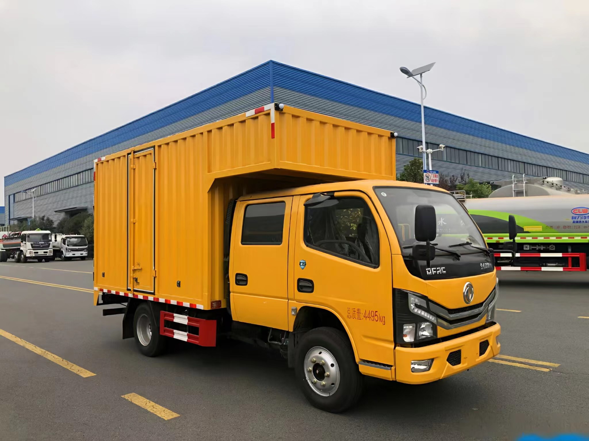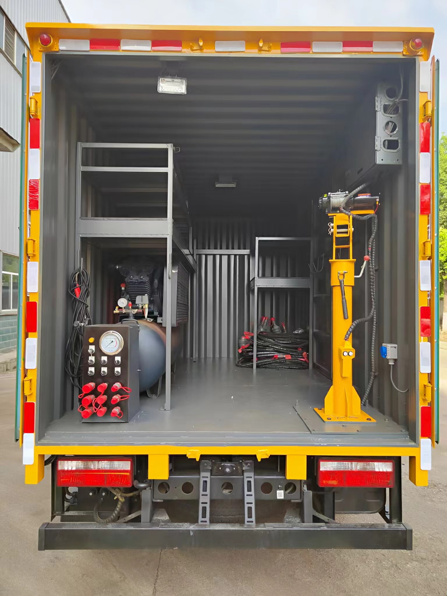 上裝配置 | 箱體采用瓦楞箱體,側(cè)面和后面各一個(gè)雙開(kāi)門,箱內(nèi)設(shè)計(jì)兩個(gè)貨架,箱內(nèi)設(shè)計(jì)照明燈,安裝液壓動(dòng)力系統(tǒng),三套液壓動(dòng)力取力快速接口,帶控制面板兩臺(tái)4寸的渣漿泵,帶水帶和液壓管(帶快接)裝一個(gè)液壓驅(qū)動(dòng)空壓機(jī),一個(gè)800公斤12V電控小吊機(jī)安裝3500W逆變器,帶電控箱,其他程力專用車廠家標(biāo)配… |