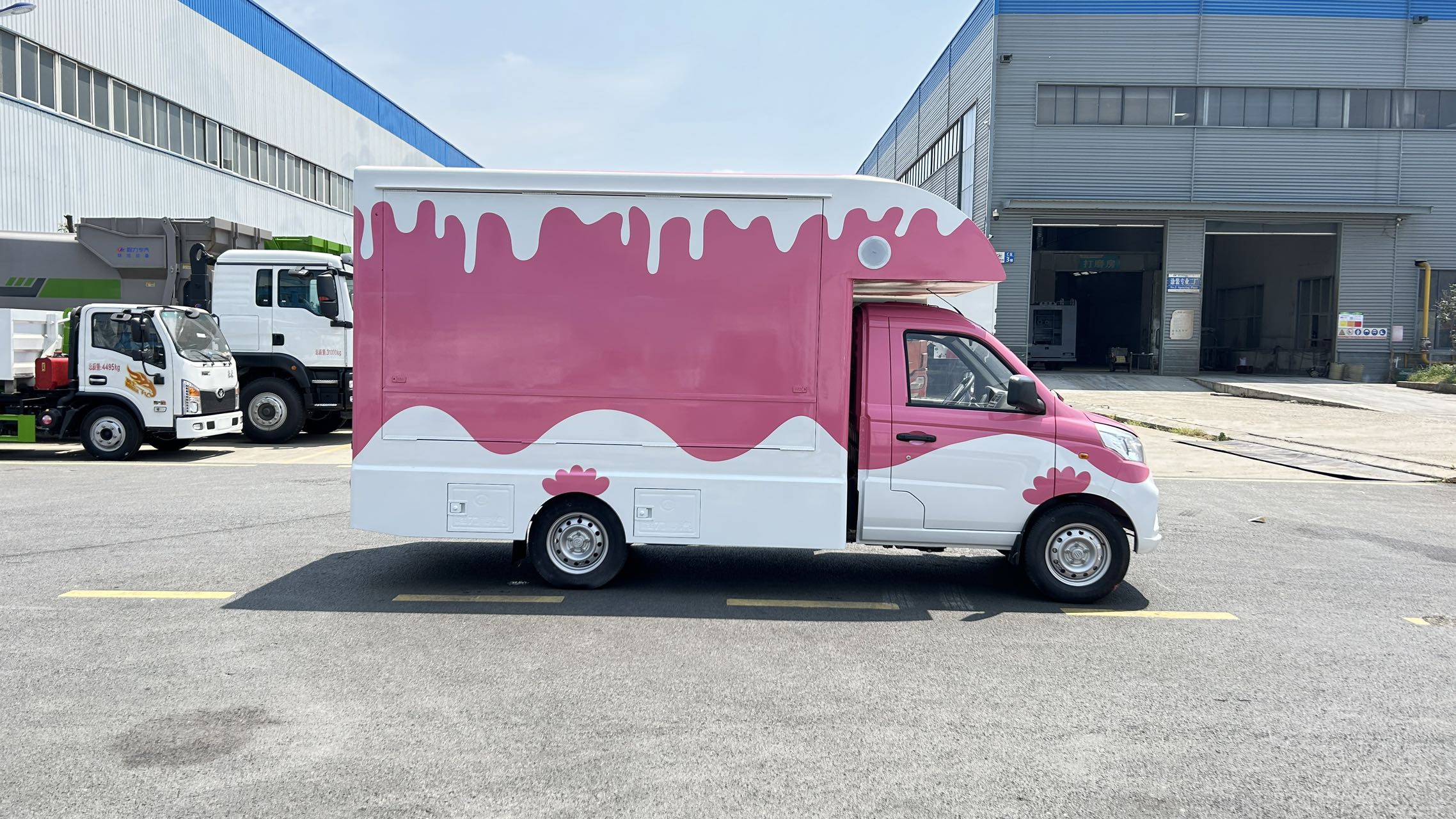 上裝配置 | 1,箱體材質:矩形方管骨架,冷板蒙皮結構,翻板采用內外彩鋼板,中間高性能保溫板,側板整體復合,輕量化,保溫隔熱。整體車身顏色為白色,可定制車身各種顏色彩條拉花,或各種噴涂樣式,(選裝內部不銹鋼飾面板) 2,箱體結構: (1)箱體鴨嘴額頭設計,帶儲物功能。 (2)箱體兩側上翻板,帶下翻吧臺。 (3)地板為防滑鋁花紋板,箱體裙邊包圍,帶檢修艙門,工具柜。 | ||